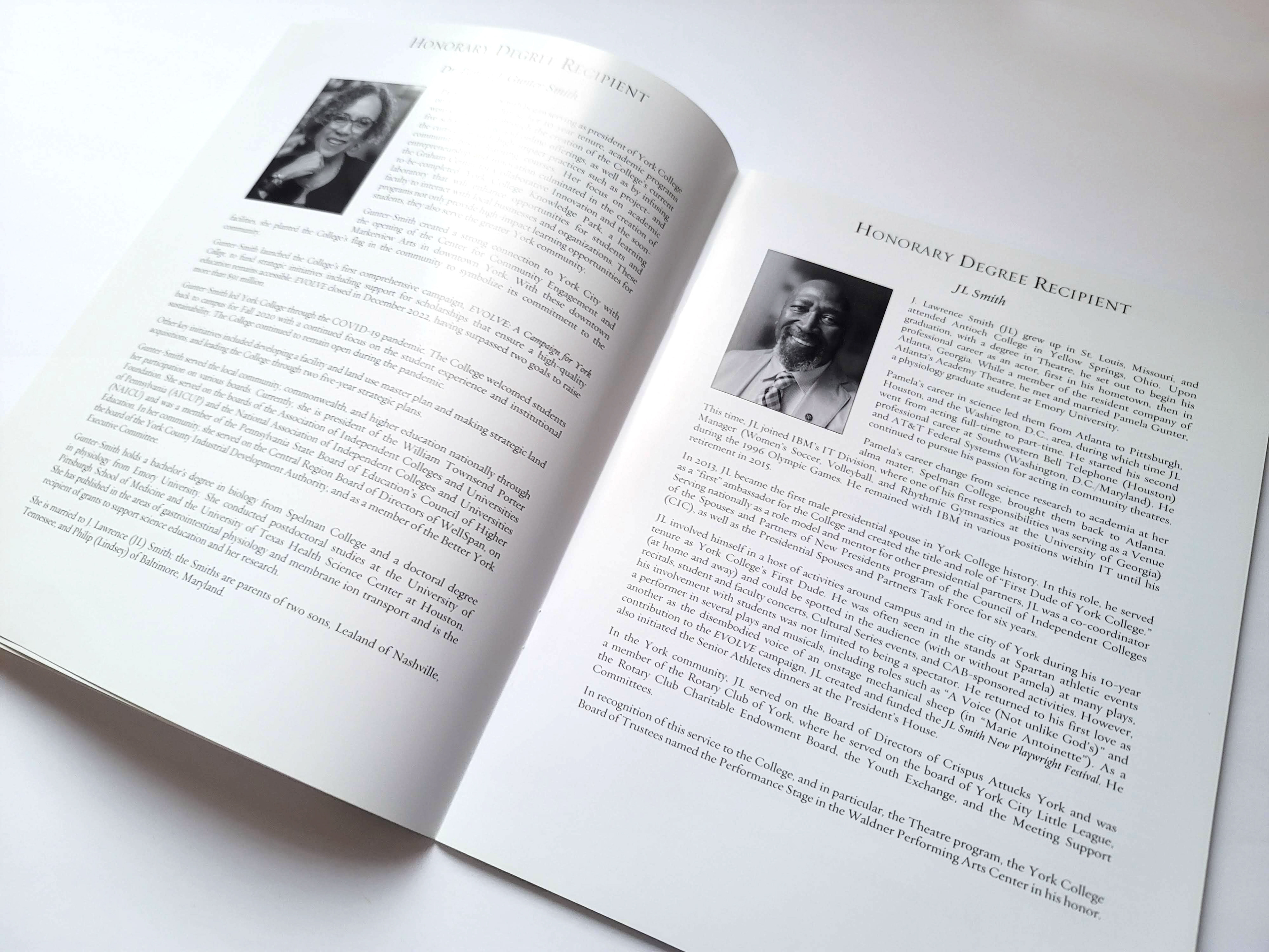 A spread showing two Honorary Degree Recipients