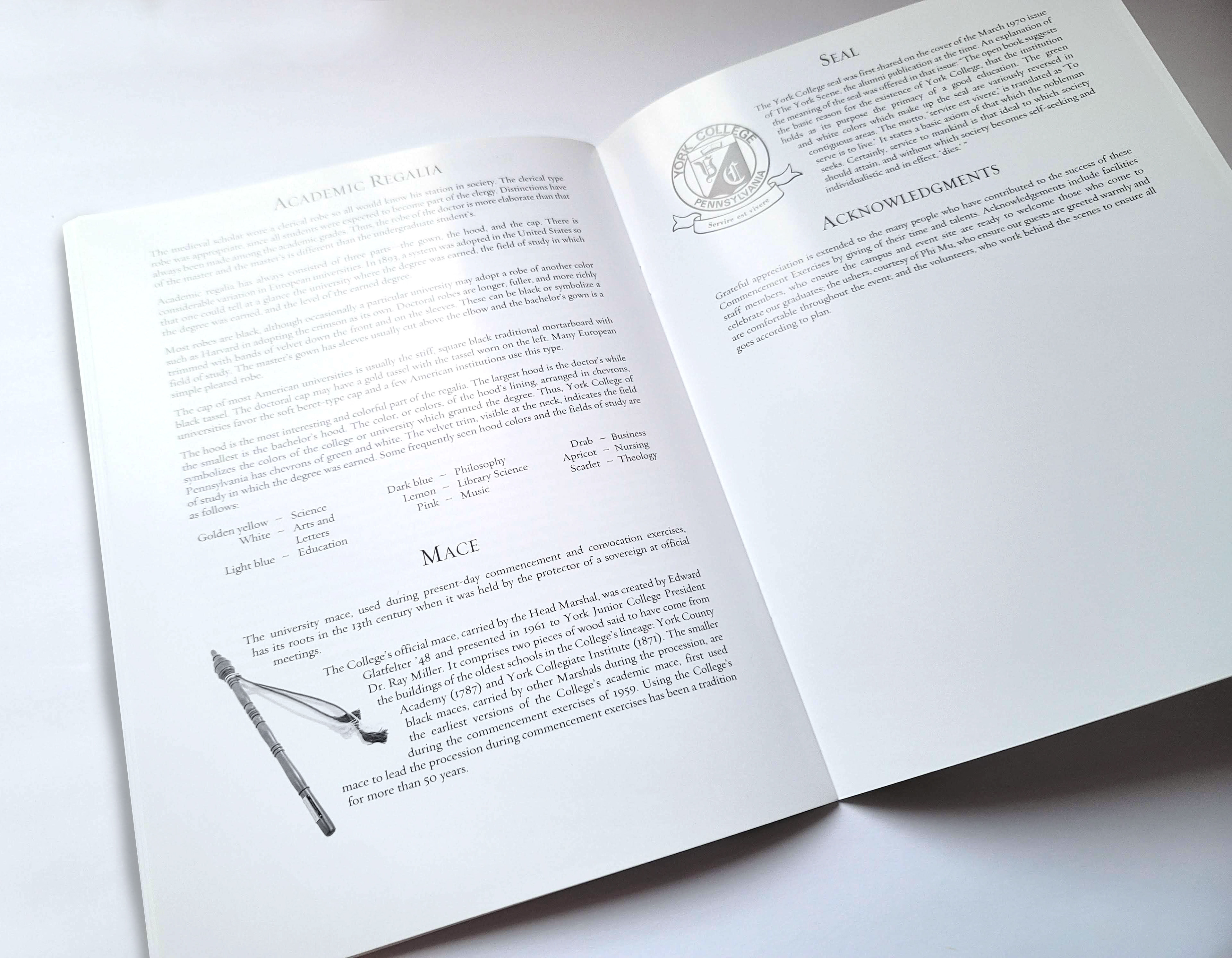 A spread showing the description of the Academic Regalia, Mace, Seal, and a brief Acknowledgments paragraph