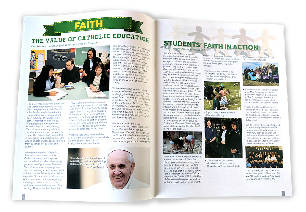 A 32 page quarterly publication I designed for York Catholic High School. Below are images of the cover as well as some of the spreads.